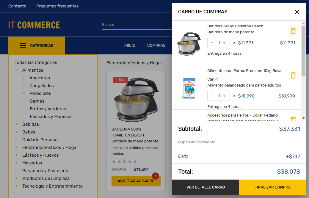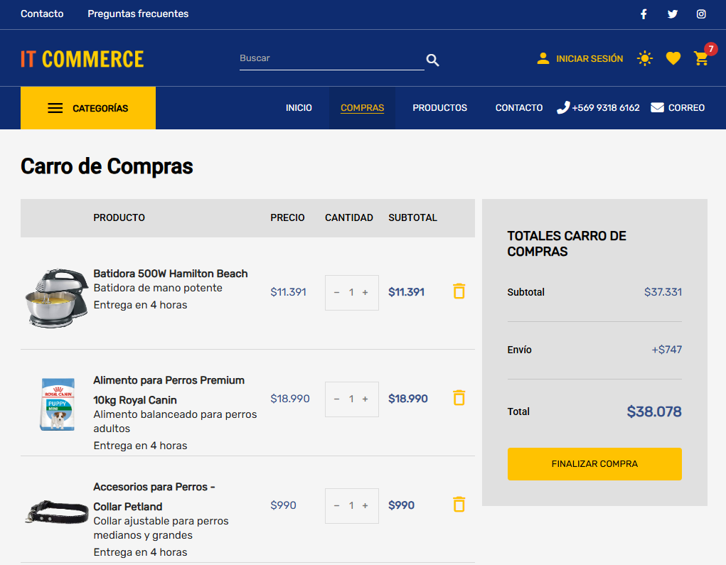 - Navegación intuitiva: Diseño optimizado para dispositivos móviles y de escritorio que permite buscar, filtrar y ordenar productos rápidamente.