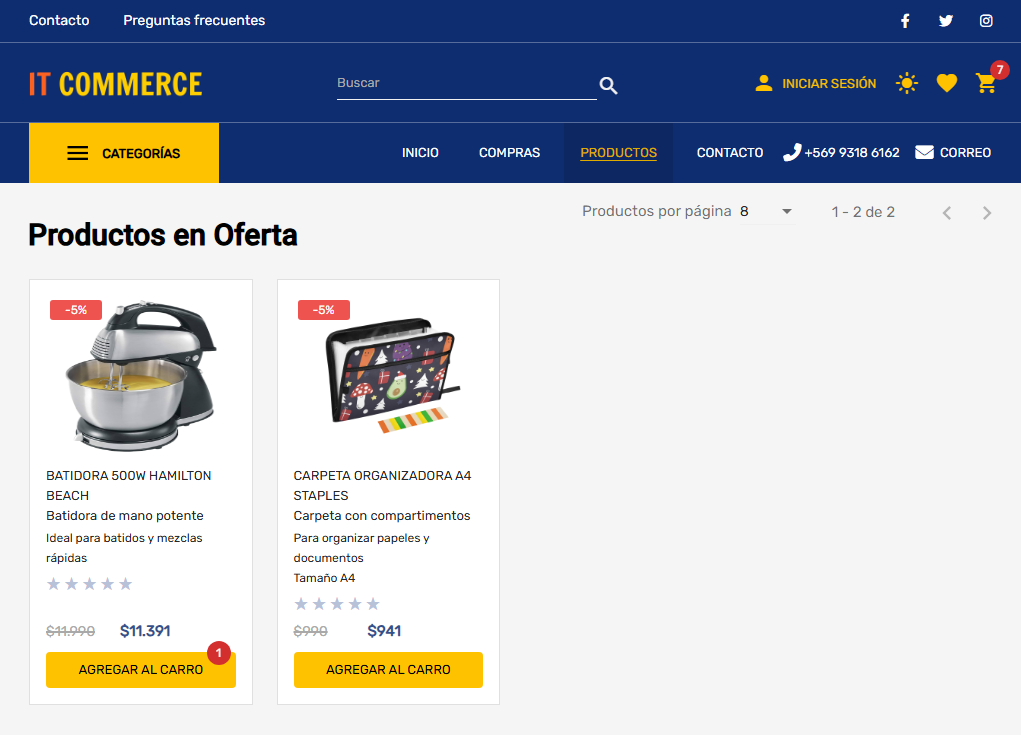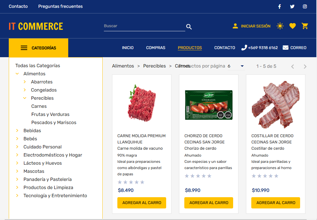 - Navegación intuitiva: Diseño optimizado para dispositivos móviles y de escritorio que permite buscar, filtrar y ordenar productos rápidamente.